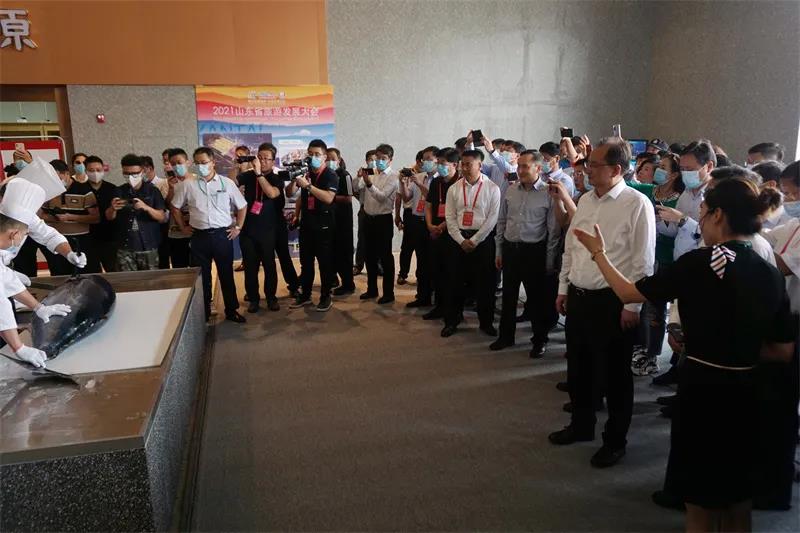 “咣!上魚嘍!”伴隨一聲嘹亮的吆喝,六人抬著一條200斤重的的金槍魚,送到展示廳廚師面前現(xiàn)場開魚,作為隆重又極具特色的海洋民俗文化,碩大的金槍魚在主刀廚師手里,僅僅幾分鐘就被去頭去尾,剔骨剝?nèi)?現(xiàn)場觀眾不禁叫絕。9月23日下午,2021山東省旅游發(fā)展大會參會代表一行來到芝罘灣商旅綜合體觀摩考察,...