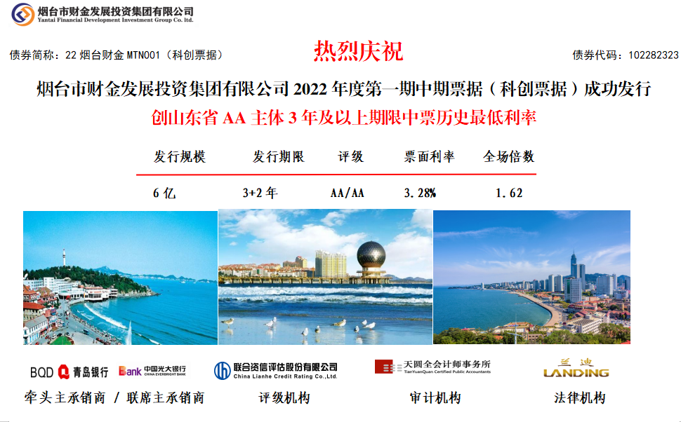 10月20日,集團2022年度首期中期票據(jù)(科創(chuàng)票據(jù))成功發(fā)行!發(fā)行規(guī)模6億元,期限3+2年,票面利率3.28%,全場認購倍數(shù)1.62倍,創(chuàng)山東省AA主體3年及以上期限中票歷史最低利率,同時也是山東省首筆基金類科創(chuàng)票據(jù),煙臺市首筆用途類科創(chuàng)票據(jù)。本期債券發(fā)行由青島銀行牽頭主承,光大銀行聯(lián)席主承,聯(lián)合資信、天圓全會計師事務(wù)所及蘭迪律師事務(wù)所分別提供信用評級、審計和法律服務(wù)。
