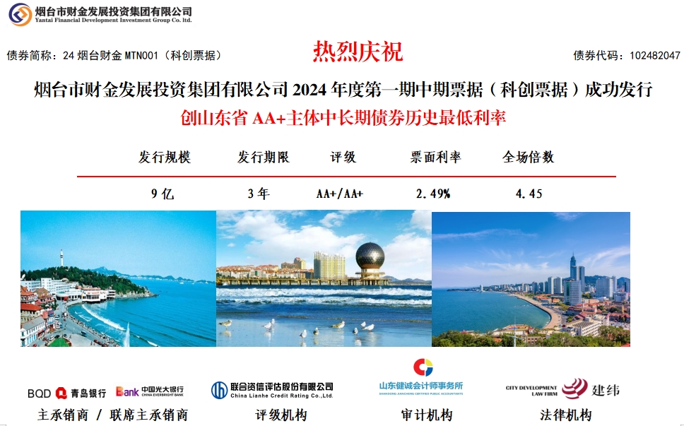 5月24日,煙臺(tái)財(cái)金集團(tuán)2024年度第一期中期票據(jù)(科創(chuàng)票據(jù))成功發(fā)行。本次中期票據(jù)發(fā)行規(guī)模9億元,發(fā)行期限3年,票面利率2.49%,全場(chǎng)認(rèn)購倍數(shù)4.45倍,創(chuàng)山東省AA+主體中長(zhǎng)期債券歷史最低利率。